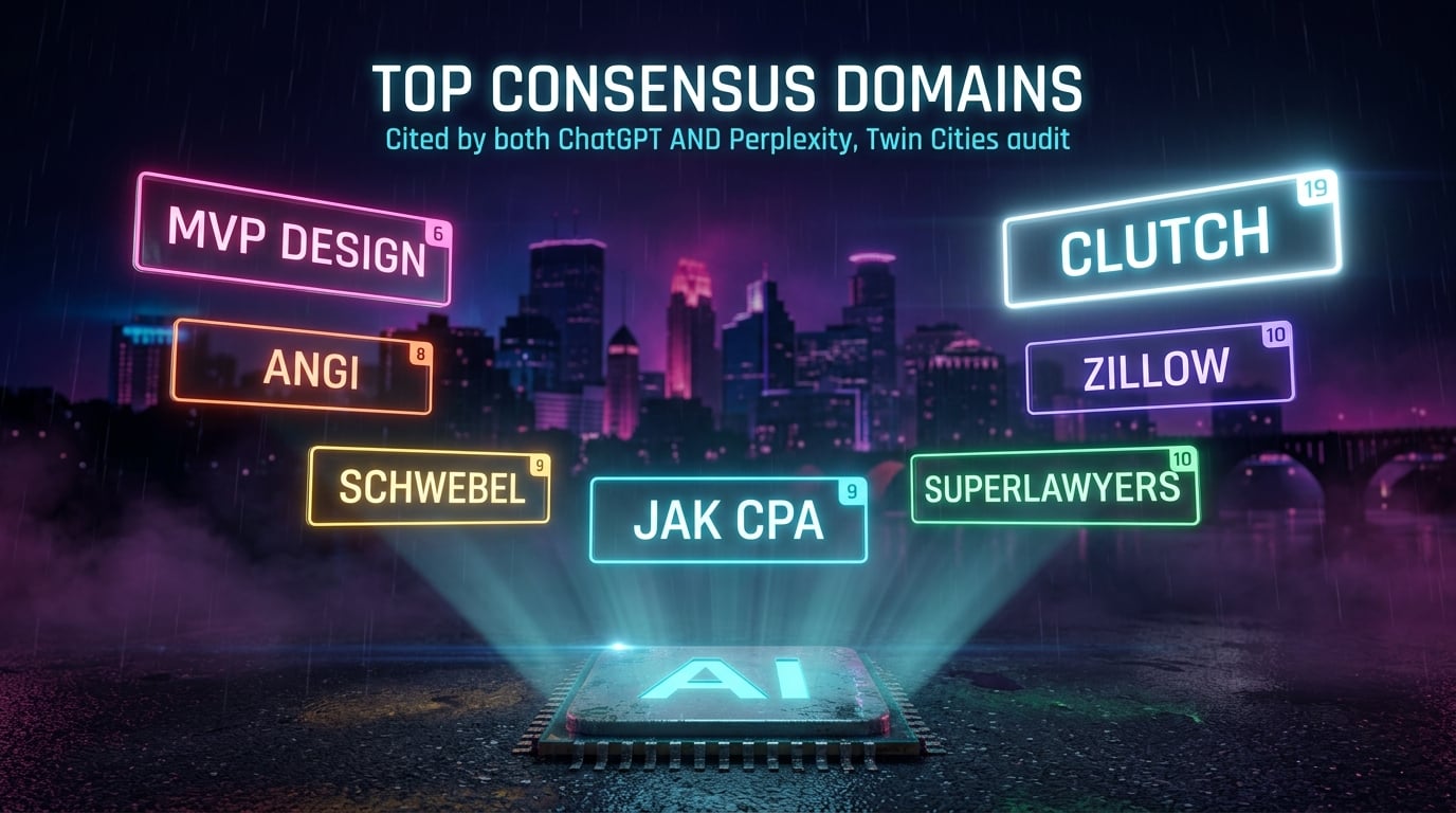 Look at the list and a pattern jumps out. Most of the consensus picks are intermediaries: third-party directories and ranking sites like Clutch (web design rankings), SuperLawyers (legal directory), Angi (home services), and Zillow (real estate). The few actual operating businesses on the consensus list (JAK CPA, Schwebel Law Firm, MVP Design) all share three traits. Each has been around for decades. Each has been written about by editorial outlets in the Twin Cities. And each maintains active, complete profiles on the directories. They've won both motions, the journalist motion AND the shopper motion.