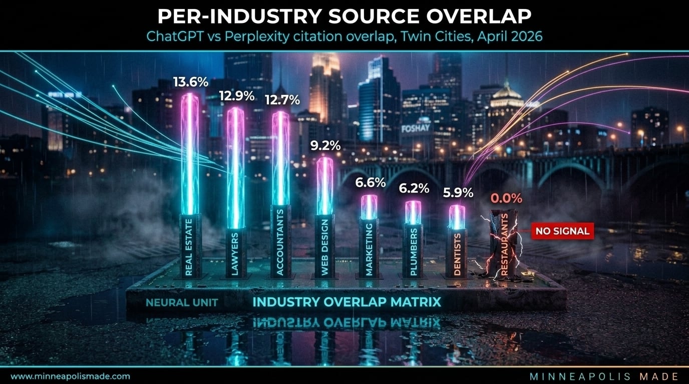 This isn't unique to Minneapolis. A national study by Yext that looked at 17.2 million AI citations found just 11% overlap between AI platforms across the whole country. Our local data came in even more divergent than that. The per-industry breakdown is where the picture gets sharper. Real estate agents and lawyers showed the most overlap at about 13%. Restaurants showed exactly zero overlap. Not a single source in common.