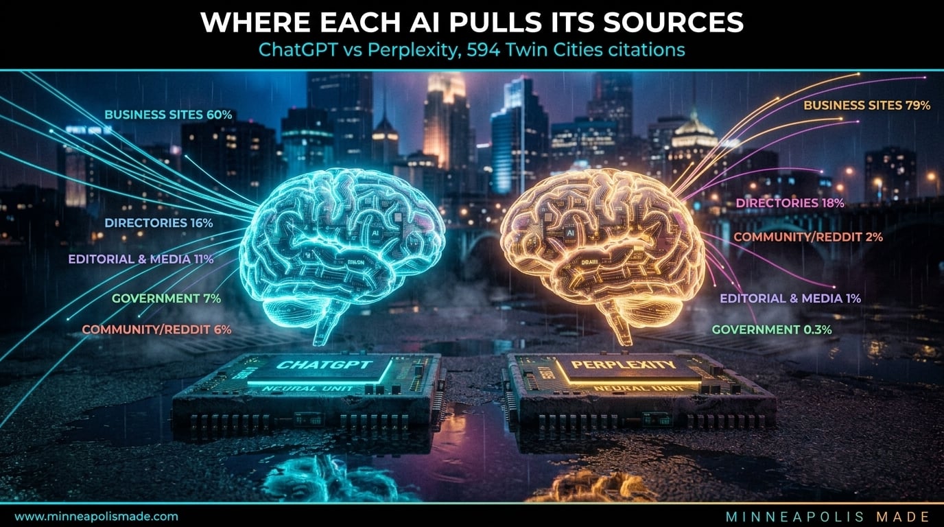 Across the 96 questions we asked, only 8.6% of recommendations appeared on both ChatGPT and Perplexity. Not 80%, not 50%. Less than 1 in 10. ChatGPT recommended 161 sources Perplexity never mentioned. Perplexity recommended 315 sources ChatGPT never mentioned. They are operating on largely separate worlds of who matters in the Twin Cities.