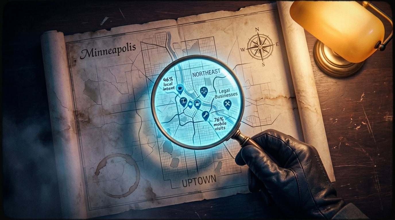 Forty-six percent of all Google searches have local intent, meaning the searcher wants a business near them (BrightLocal Local Consumer Review Survey, 2025). For Minneapolis businesses that translates to thousands of daily queries from people who are actively ready to buy. Someone Googling “plumber near me” from Uptown isn’t doing research, they’re about to spend money. The question is just which plumber’s name shows up when they look.