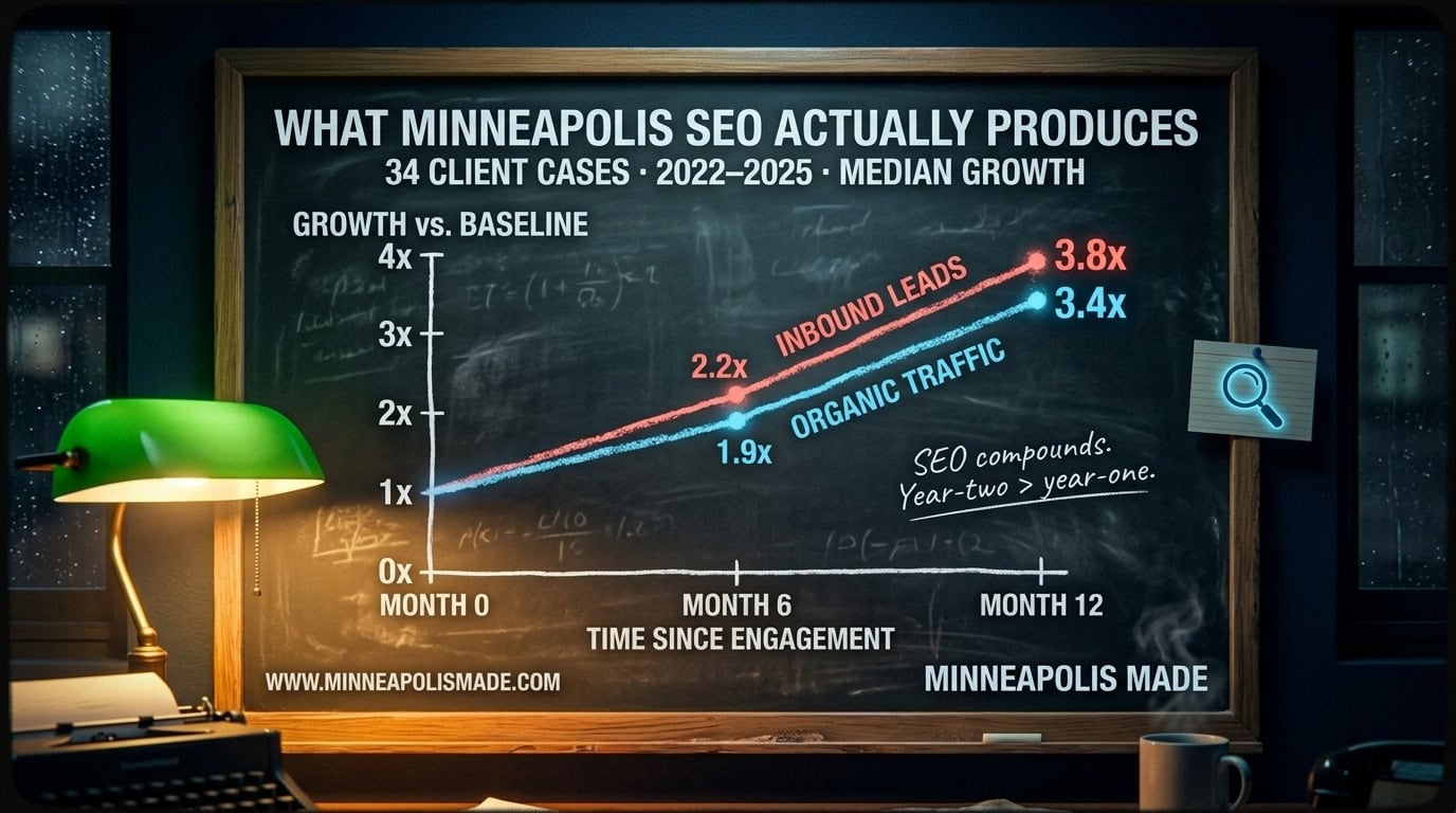 Across 34 Minneapolis client engagements tracked at Minneapolis Made between 2022 and 2025, the median result at the 6-month mark was: rankings improved for 73% of tracked keywords, organic traffic grew by 1.9x, and inbound leads attributed to organic search grew by 2.2x. At month 12 the numbers were: 84% of tracked keywords improved, traffic grew 3.4x, and leads grew 3.8x. The variance was real: some clients saw 10x in a year, others saw 1.5x. The median case clears the math for most small businesses paying $2,500 a month.