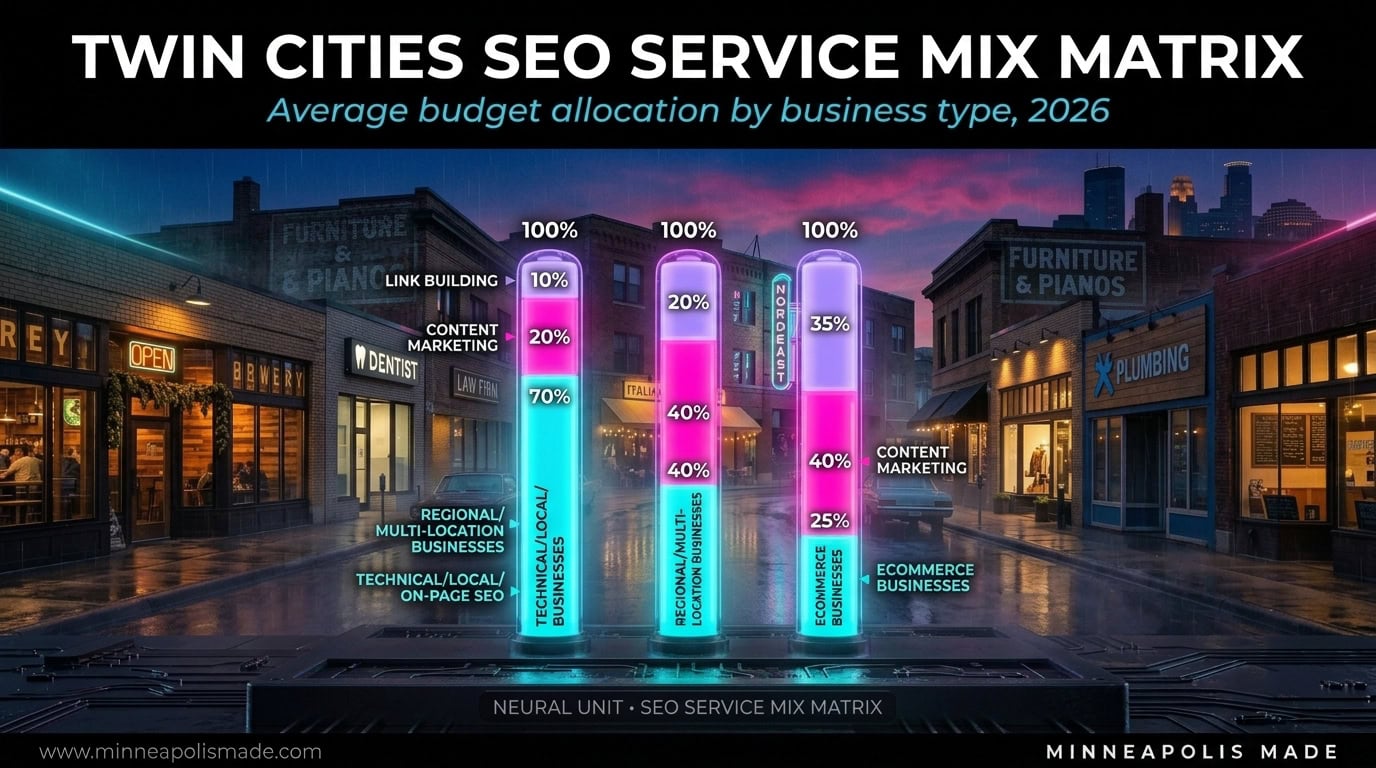 Unique InsightAcross 34 Twin Cities clients, the pattern that repeatedly produces strong results for single-location Minneapolis businesses is a 70/20/10 split. Seventy percent of the effort goes to technical SEO plus local SEO plus on-page. Twenty percent goes to content marketing focused tightly on local topics. Ten percent goes to targeted link building.