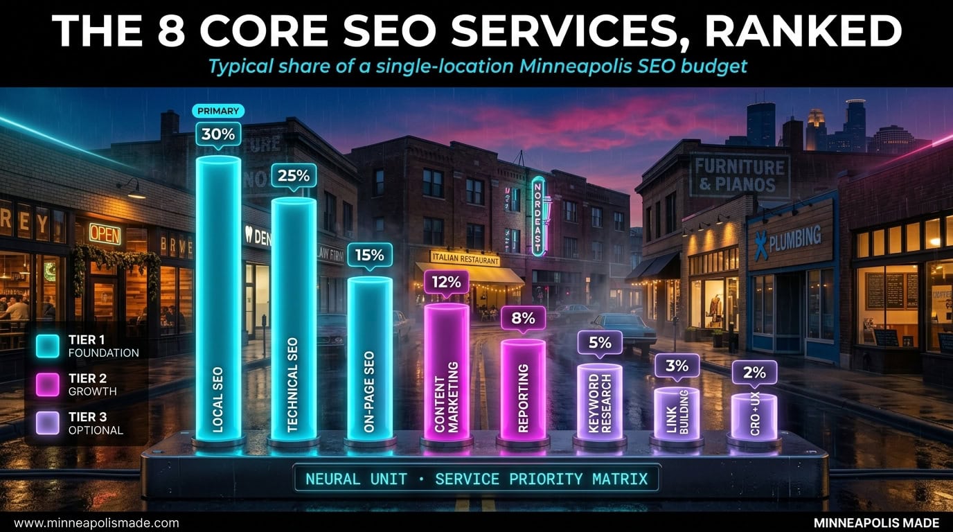 - Eight core SEO services exist, most Minneapolis businesses need 3-5 of them, not all eight