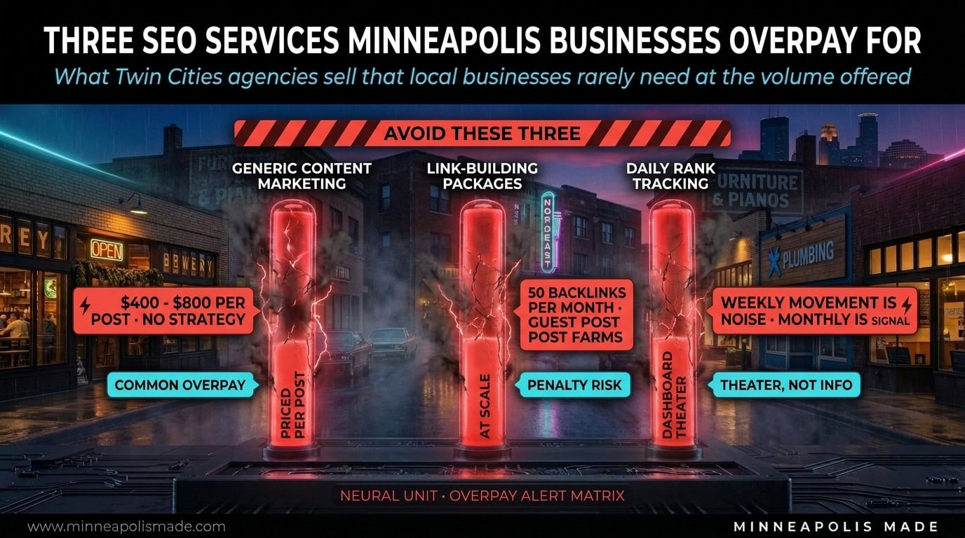A Minneapolis business skipping those three over-priced service categories typically saves $1,000-$2,000 per month that can be redirected to the services that actually move rankings.
