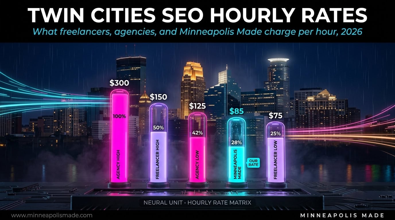 The median monthly SEO retainer for Minneapolis businesses is $2,000–$3,000 per month, but Minneapolis Made bills hourly at $85/hour with no minimum commitment. Single-location service businesses on retainers typically spend $1,000–$3,500, regional businesses $3,500–$7,500, ecommerce $3,500–$30,000. Twin Cities freelancers charge $75–$150 per hour and retainer agencies $125–$300 per hour.