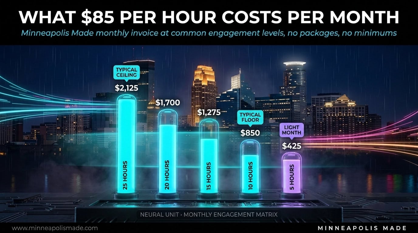 - Minneapolis Made bills $85/hour with no minimum commitment and no packages; most active SEO engagements settle at 10–25 hours per month