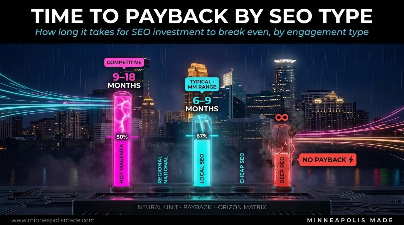 Local SEO typically pays for itself between month 6 and month 9 for single-location Twin Cities businesses at the $1,500-$3,000 tier. Regional and competitive campaigns at $5,000+ tend to pay back between months 9 and 15. Cheap SEO (under $600/month) usually never pays for itself because the scope is too narrow.
